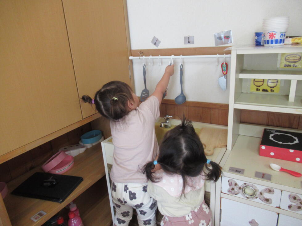 お玉でお料理がしたいのに手が届かず、「とって~!」の声に、取ってあげようとする優しい場面♡