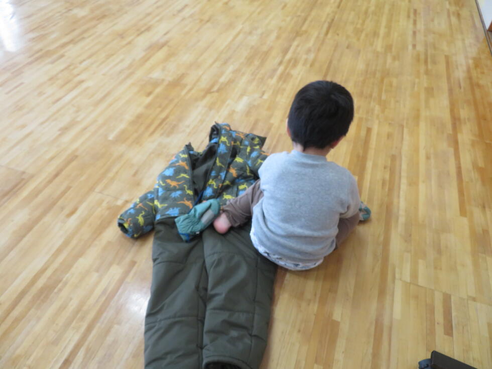 お外に行く前に、上着やスキーウェアを着て準備します。