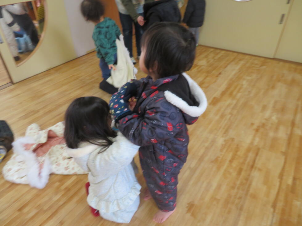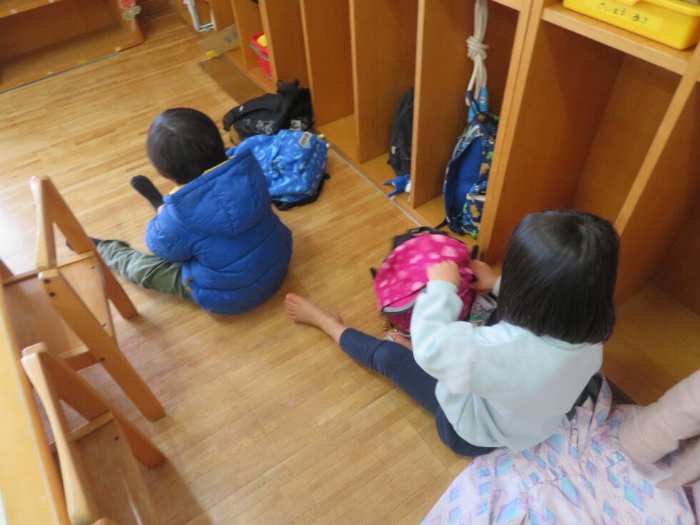 大きい組さんが小さい子の準備を手伝ったり、友達同士で助け合いながらやってみたり、自分でじっくり考えて準備したりと、着替えひとつにも成長を感じているところです♪